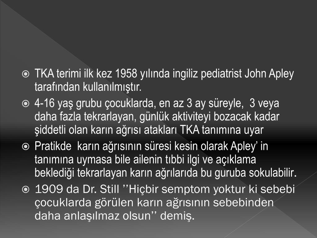 TEKRARLAYAN KARIN AĞRILARI. TKA terimi ilk kez 1958 yılında ingiliz pediatrist John Apley tarafından kullanılmıştır. 4-16 yaş grubu çocuklarda, en az 3 ay süreyle, 3 veya daha fazla tekrarlayan, günlük aktiviteyi bozacak kadar şiddetli olan karın ağrısı atakları TKA tanımına uyar