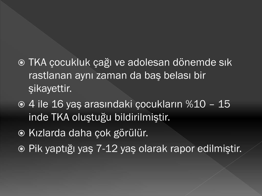 TKA çocukluk çağı ve adolesan dönemde sık rastlanan aynı zaman da baş belası bir şikayettir. • 4 ile 16 yaş arasındaki çocukların %10 – 15 inde TKA oluştuğu bildirilmiştir. • Kızlarda daha çok görülür. • Pik yaptığı yaş 7-12 yaş olarak rapor edilmiştir.
