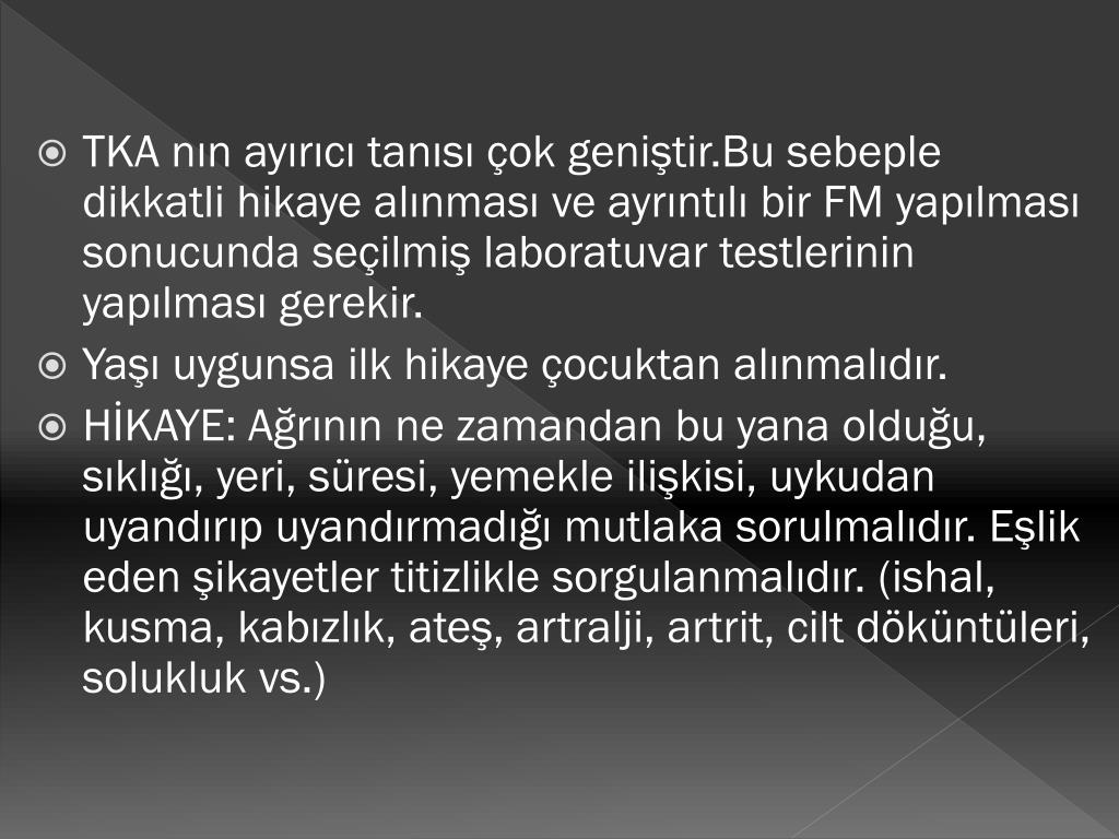 TKA nın ayırıcı tanısı çok geniştir.Bu sebeple dikkatli hikaye alınması ve ayrıntılı bir FM yapılması sonucunda seçilmiş laboratuvar testlerinin yapılması gerekir. • Yaşı uygunsa ilk hikaye çocuktan alınmalıdır. • HİKAYE: Ağrının ne zamandan bu yana olduğu, sıklığı, yeri, süresi, yemekle ilişkisi, uykudan uyandırıp uyandırmadığı mutlaka sorulmalıdır. Eşlik eden şikayetler titizlikle sorgulanmalıdır. (ishal, kusma, kabızlık, ateş, artralji, artrit, cilt döküntüleri, solukluk vs.)
