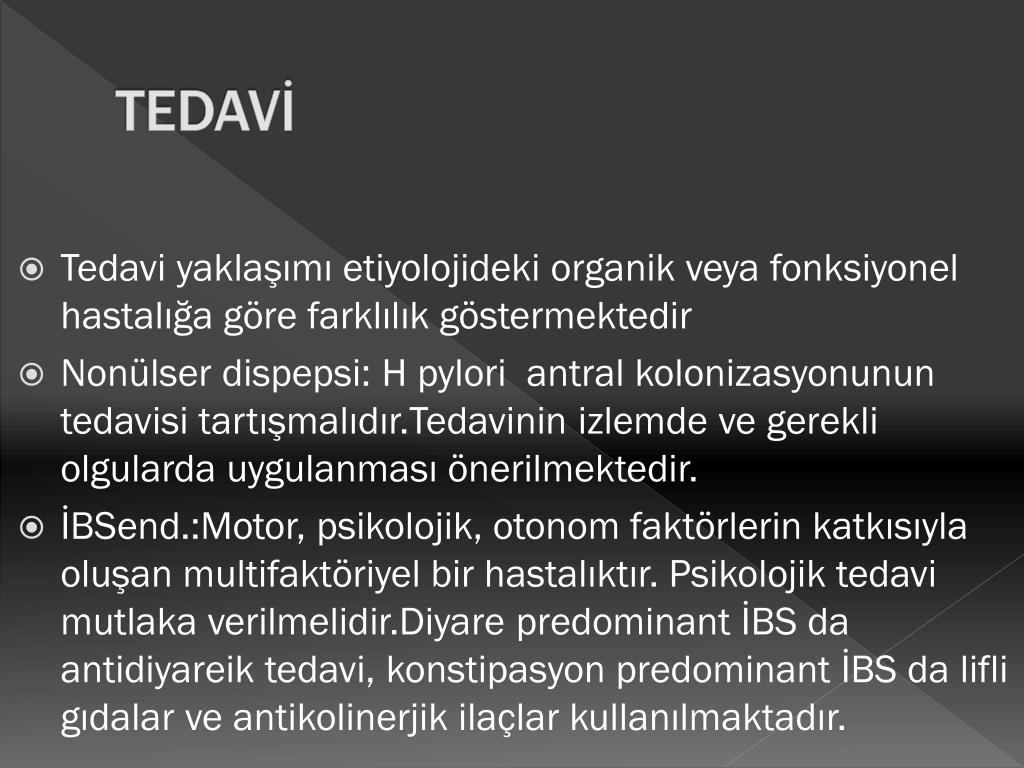 TEDAVİ • Tedavi yaklaşımı etiyolojideki organik veya fonksiyonel hastalığa göre farklılık göstermektedir • Nonülser dispepsi: H pylori antral kolonizasyonunun tedavisi tartışmalıdır.Tedavinin izlemde ve gerekli olgularda uygulanması önerilmektedir. • İBSend.:Motor, psikolojik, otonom faktörlerin katkısıyla oluşan multifaktöriyel bir hastalıktır. Psikolojik tedavi mutlaka verilmelidir.Diyare predominant İBS da antidiyareik tedavi, konstipasyon predominant İBS da lifli gıdalar ve antikolinerjik ilaçlar kullanılmaktadır.