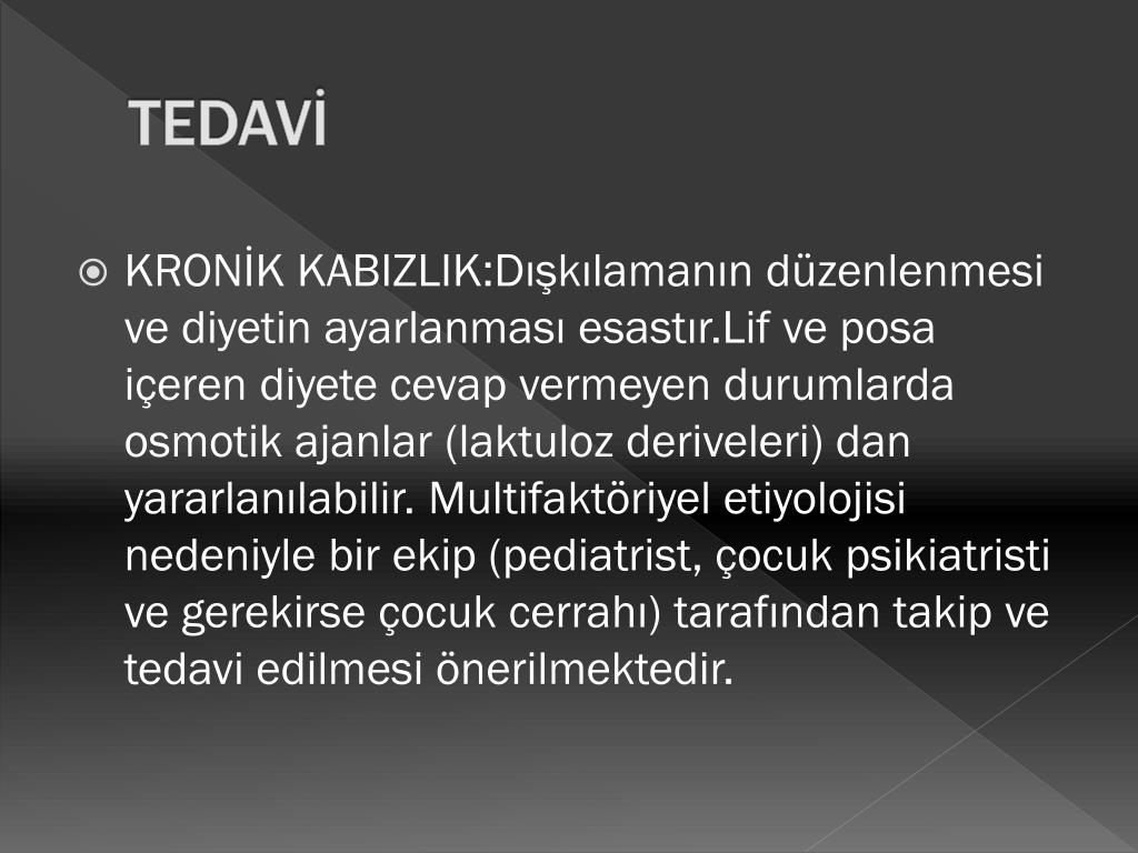 TEDAVİ • KRONİK KABIZLIK:Dışkılamanın düzenlenmesi ve diyetin ayarlanması esastır.Lif ve posa içeren diyete cevap vermeyen durumlarda osmotik ajanlar (laktuloz deriveleri) dan yararlanılabilir. Multifaktöriyel etiyolojisi nedeniyle bir ekip (pediatrist, çocuk psikiatristi ve gerekirse çocuk cerrahı) tarafından takip ve tedavi edilmesi önerilmektedir.