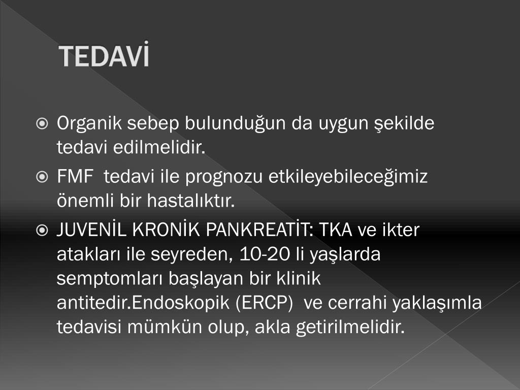 TEDAVİ • Organik sebep bulunduğun da uygun şekilde tedavi edilmelidir. • FMF tedavi ile prognozu etkileyebileceğimiz önemli bir hastalıktır. • JUVENİL KRONİK PANKREATİT: TKA ve ikter atakları ile seyreden, 10-20 li yaşlarda semptomları başlayan bir klinik antitedir.Endoskopik (ERCP) ve cerrahi yaklaşımla tedavisi mümkün olup, akla getirilmelidir.