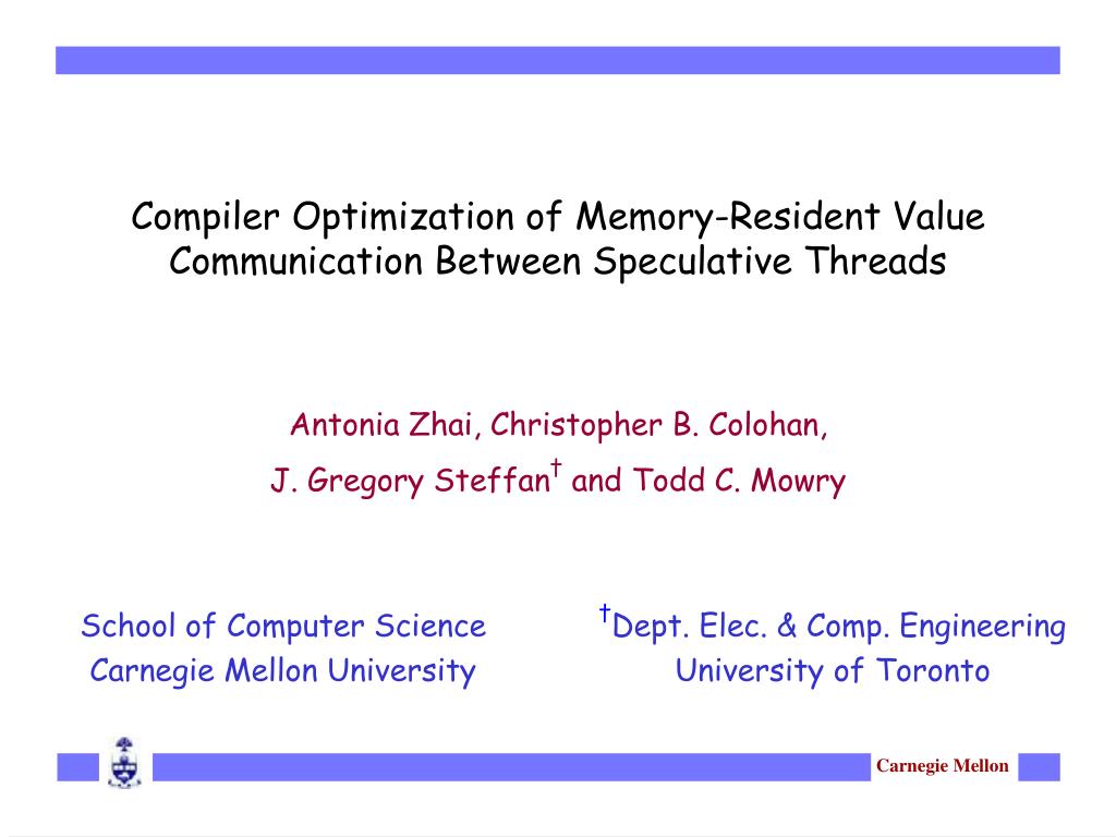 Compiler Optimization of Memory-Resident Value Communication Between Speculative Threads. Antonia Zhai, Christopher B. Colohan, J. Gregory Steffan † and Todd C. Mowry. School of Computer Science Carnegie Mellon University. † Dept. Elec. & Comp. Engineering University of Toronto.