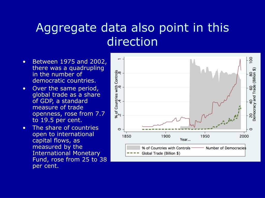 Aggregate data also point in this direction • Between 1975 and 2002, there was a quadrupling in the number of democratic countries. • Over the same period, global trade as a share of GDP, a standard measure of trade openness, rose from 7.7 to 19.5 per cent. • The share of countries open to international capital flows, as measured by the International Monetary Fund, rose from 25 to 38 per cent.
