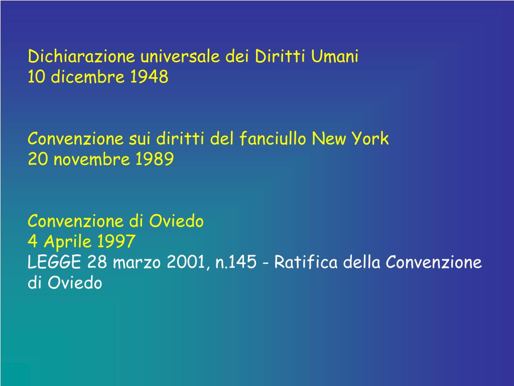 Dichiarazione universale dei Diritti Umani 10 dicembre 1948 Convenzione sui diritti del fanciullo New York 20 novembre 1989 Convenzione di Oviedo 4 Aprile 1997 LEGGE 28 marzo 2001, n.145 - Ratifica della Convenzione di Oviedo