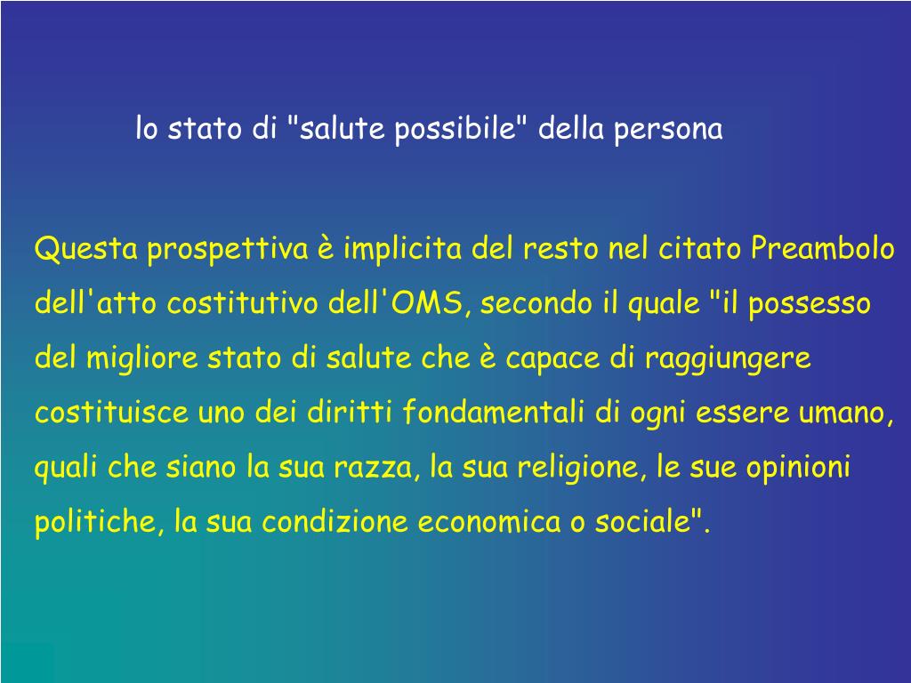 lo stato di "salute possibile" della persona Questa prospettiva è implicita del resto nel citato Preambolo dell'atto costitutivo dell'OMS, secondo il quale "il possesso del migliore stato di salute che è capace di raggiungere costituisce uno dei diritti fondamentali di ogni essere umano, quali che siano la sua razza, la sua religione, le sue opinioni politiche, la sua condizione economica o sociale".