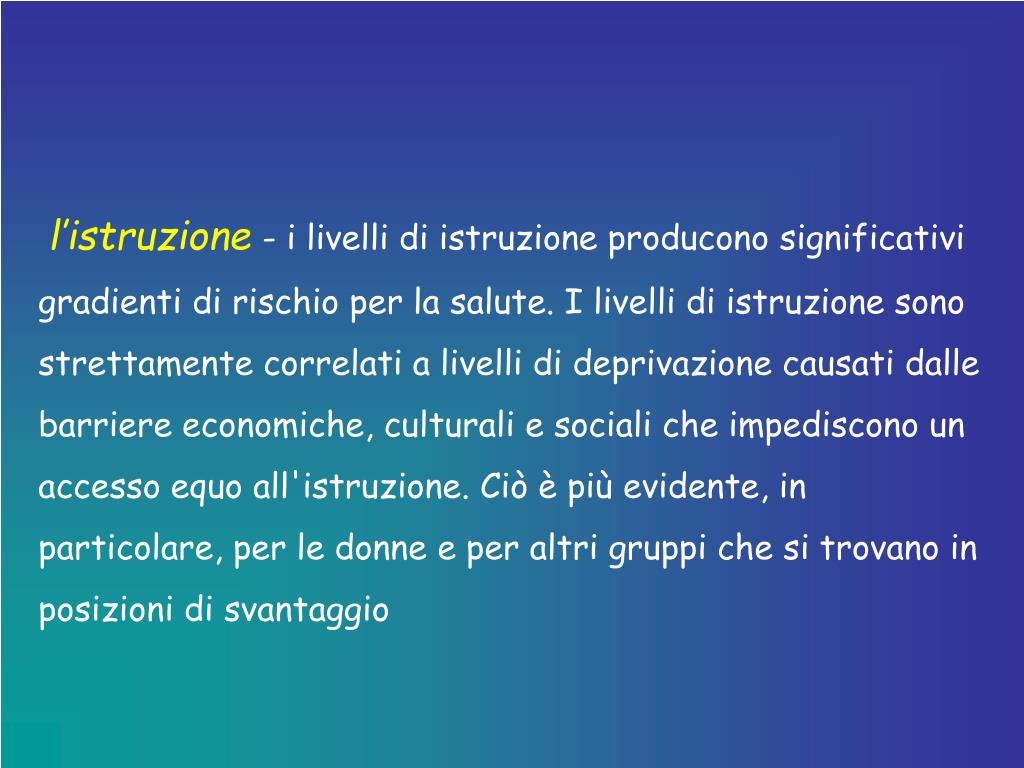 l’istruzione - i livelli di istruzione producono significativi gradienti di rischio per la salute. I livelli di istruzione sono strettamente correlati a livelli di deprivazione causati dalle barriere economiche, culturali e sociali che impediscono un accesso equo all'istruzione. Ciò è più evidente, in particolare, per le donne e per altri gruppi che si trovano in posizioni di svantaggio