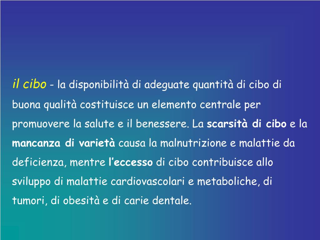 il cibo- la disponibilità di adeguate quantità di cibo di buona qualità costituisce un elemento centrale per promuovere la salute e il benessere. La scarsità di cibo e la mancanza di varietà causa la malnutrizione e malattie da deficienza, mentre l’eccesso di cibo contribuisce allo sviluppo di malattie cardiovascolari e metaboliche, di tumori, di obesità e di carie dentale.