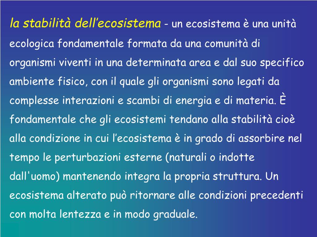 la stabilità dell’ecosistema- un ecosistema è una unità ecologica fondamentale formata da una comunità di organismi viventi in una determinata area e dal suo specifico ambiente fisico, con il quale gli organismi sono legati da complesse interazioni e scambi di energia e di materia. È fondamentale che gli ecosistemi tendano alla stabilità cioè alla condizione in cui l’ecosistema è in grado di assorbire nel tempo le perturbazioni esterne (naturali o indotte dall'uomo) mantenendo integra la propria struttura. Un ecosistema alterato può ritornare alle condizioni precedenti con molta lentezza e in modo graduale.