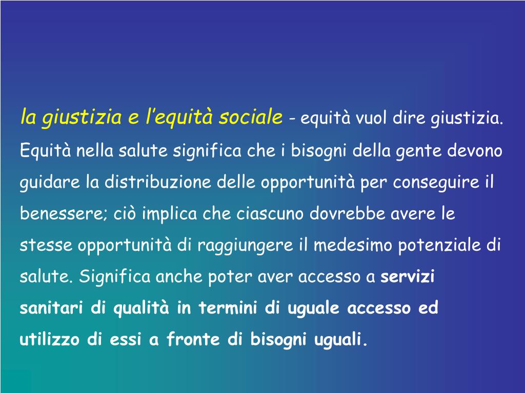 la giustizia e l’equità sociale- equità vuol dire giustizia. Equità nella salute significa che i bisogni della gente devono guidare la distribuzione delle opportunità per conseguire il benessere; ciò implica che ciascuno dovrebbe avere le stesse opportunità di raggiungere il medesimo potenziale di salute. Significa anche poter aver accesso a servizi sanitari di qualità in termini di uguale accesso ed utilizzo di essi a fronte di bisogni uguali.