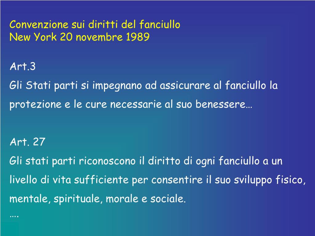 Convenzione sui diritti del fanciullo New York 20 novembre 1989 Art.3 Gli Stati parti si impegnano ad assicurare al fanciullo la protezione e le cure necessarie al suo benessere… Art. 27 Gli stati parti riconoscono il diritto di ogni fanciullo a un livello di vita sufficiente per consentire il suo sviluppo fisico, mentale, spirituale, morale e sociale. ….
