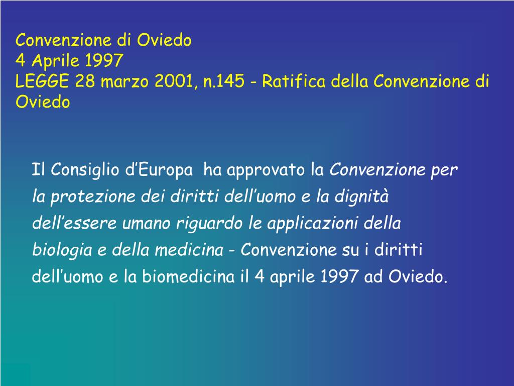 Convenzione di Oviedo 4 Aprile 1997 LEGGE 28 marzo 2001, n.145 - Ratifica della Convenzione di Oviedo Il Consiglio d’Europa ha approvato la Convenzione per la protezione dei diritti dell’uomo e la dignità dell’essere umano riguardo le applicazioni della biologia e della medicina - Convenzione su i diritti dell’uomo e la biomedicina il 4 aprile 1997 ad Oviedo.
