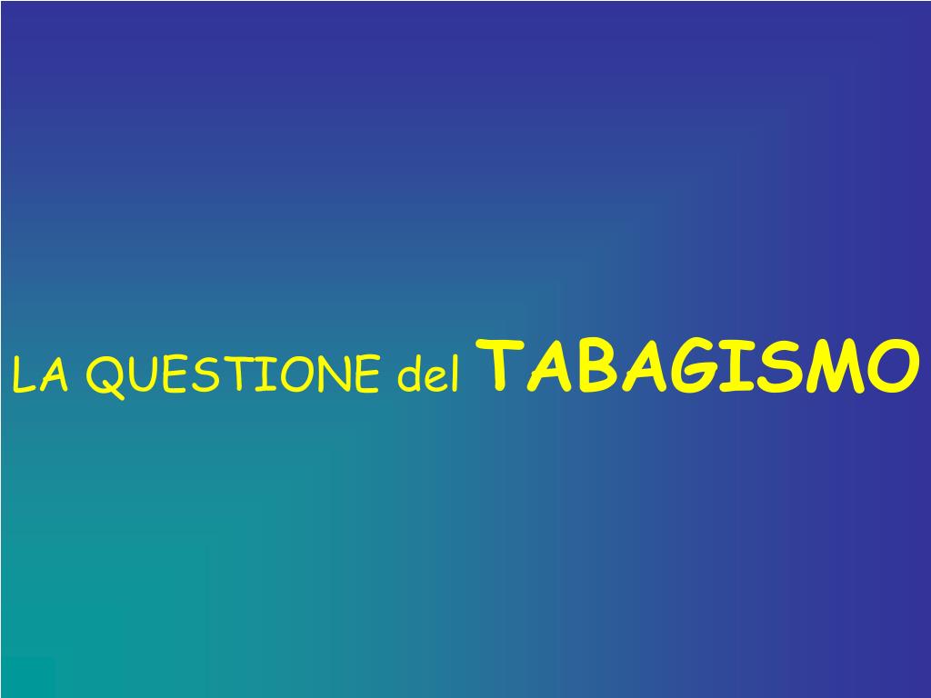 Il tabagismo, una «sindrome tossica conseguente all’uso eccessivo e protratto di tabacco», va considerata una tossicofilia, contraddistinta da un elevato grado di dipendenza. • Per la sua estensione, per la gravità e per il costo sociale dei danni sanitari che ne derivano, oltre che per la forza degli interessi in gioco, questo fenomeno costituisce uno dei grandi problemi della società moderna; esso solleva, inoltre, una serie di delicati interrogativi etici: • il confronto tra diritto individuale e diritto collettivo, • le responsabilità primarie delle istituzioni pubbliche verso i cittadini.