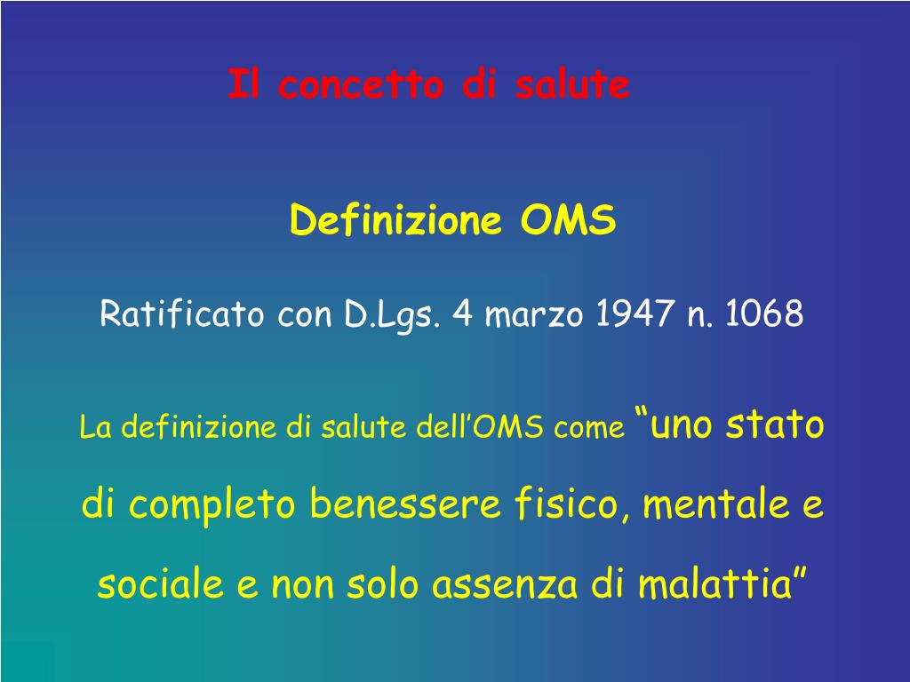 Il concetto di salute Definizione OMS Ratificato con D.Lgs. 4 marzo 1947 n. 1068 La definizione di salute dell’OMS come “uno stato di completo benessere fisico, mentale e sociale e non solo assenza di malattia”