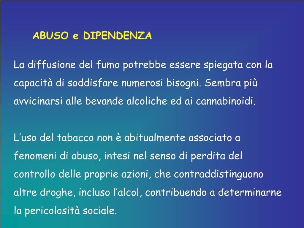 ABUSO e DIPENDENZA La diffusione del fumo potrebbe essere spiegata con la capacità di soddisfare numerosi bisogni. Sembra più avvicinarsi alle bevande alcoliche ed ai cannabinoidi. L’uso del tabacco non è abitualmente associato a fenomeni di abuso, intesi nel senso di perdita del controllo delle proprie azioni, che contraddistinguono altre droghe, incluso l’alcol, contribuendo a determinarne la pericolosità sociale.