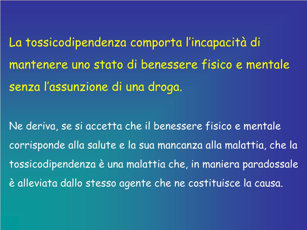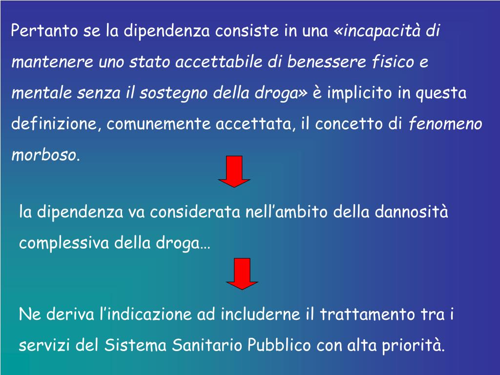 Pertanto se la dipendenza consiste in una «incapacità di mantenere uno stato accettabile di benessere fisico e mentale senza il sostegno della droga» è implicito in questa definizione, comunemente accettata, il concetto di fenomeno morboso. la dipendenza va considerata nell’ambito della dannosità complessiva della droga… Ne deriva l’indicazione ad includerne il trattamento tra i servizi del Sistema Sanitario Pubblico con alta priorità.