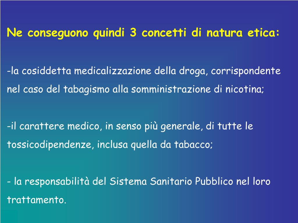 Ne conseguono quindi 3 concetti di natura etica: • la cosiddetta medicalizzazione della droga, corrispondente nel caso del tabagismo alla somministrazione di nicotina; • il carattere medico, in senso più generale, di tutte le tossicodipendenze, inclusa quella da tabacco; • - la responsabilità del Sistema Sanitario Pubblico nel loro trattamento.