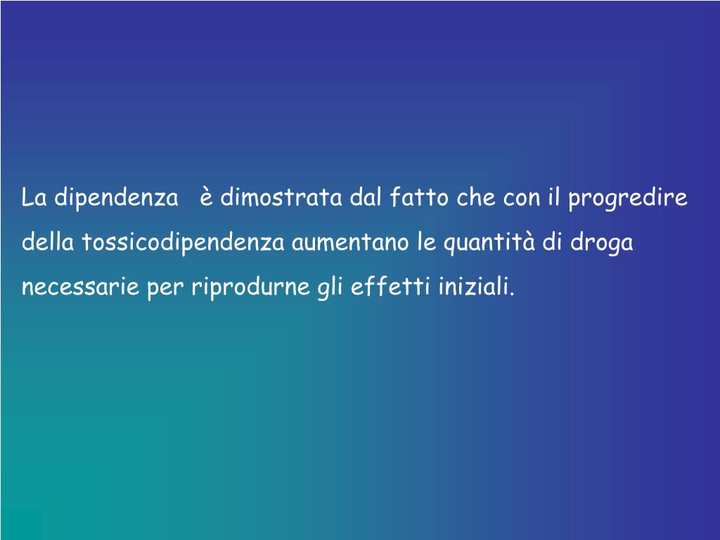 La dipendenza è dimostrata dal fatto che con il progredire della tossicodipendenza aumentano le quantità di droga necessarie per riprodurne gli effetti iniziali.