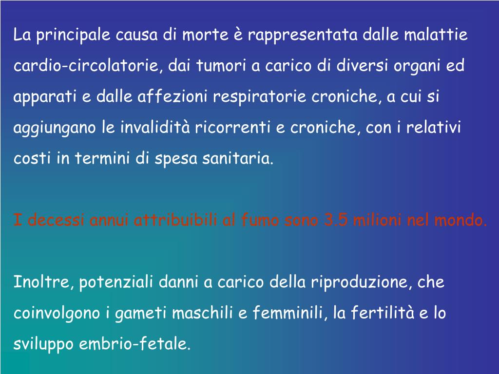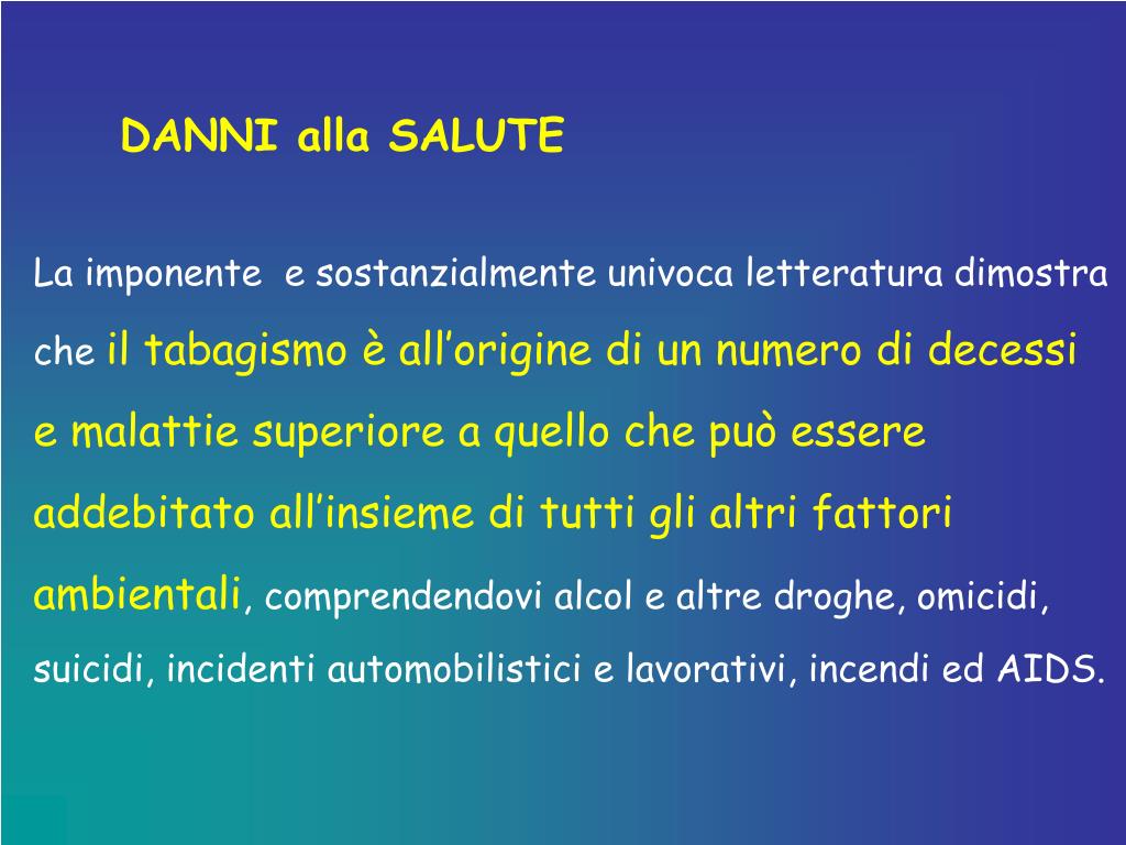 DANNI alla SALUTE La imponente e sostanzialmente univoca letteratura dimostra che il tabagismo è all’origine di un numero di decessi e malattie superiore a quello che può essere addebitato all’insieme di tutti gli altri fattori ambientali, comprendendovi alcol e altre droghe, omicidi, suicidi, incidenti automobilistici e lavorativi, incendi ed AIDS.