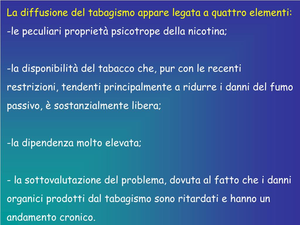 La diffusione del tabagismo appare legata a quattro elementi: • le peculiari proprietà psicotrope della nicotina; • la disponibilità del tabacco che, pur con le recenti restrizioni, tendenti principalmente a ridurre i danni del fumo passivo, è sostanzialmente libera; • la dipendenza molto elevata; • - la sottovalutazione del problema, dovuta al fatto che i danni organici prodotti dal tabagismo sono ritardati e hanno un andamento cronico.
