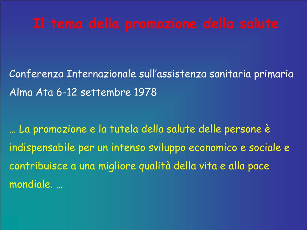 Il tema della promozione della salute Conferenza Internazionale sull’assistenza sanitaria primaria Alma Ata 6-12 settembre 1978 … La promozione e la tutela della salute delle persone è indispensabile per un intenso sviluppo economico e sociale e contribuisce a una migliore qualità della vita e alla pace mondiale. …