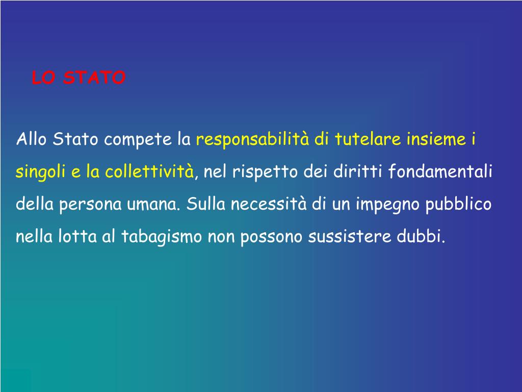 LO STATO Allo Stato compete la responsabilità di tutelare insieme i singoli e la collettività, nel rispetto dei diritti fondamentali della persona umana. Sulla necessità di un impegno pubblico nella lotta al tabagismo non possono sussistere dubbi.