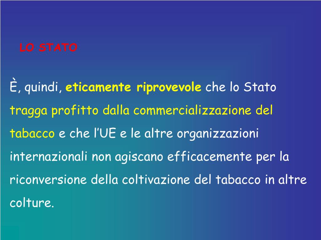 LO STATO È, quindi, eticamente riprovevole che lo Stato tragga profitto dalla commercializzazione del tabacco e che l’UE e le altre organizzazioni internazionali non agiscano efficacemente per la riconversione della coltivazione del tabacco in altre colture.