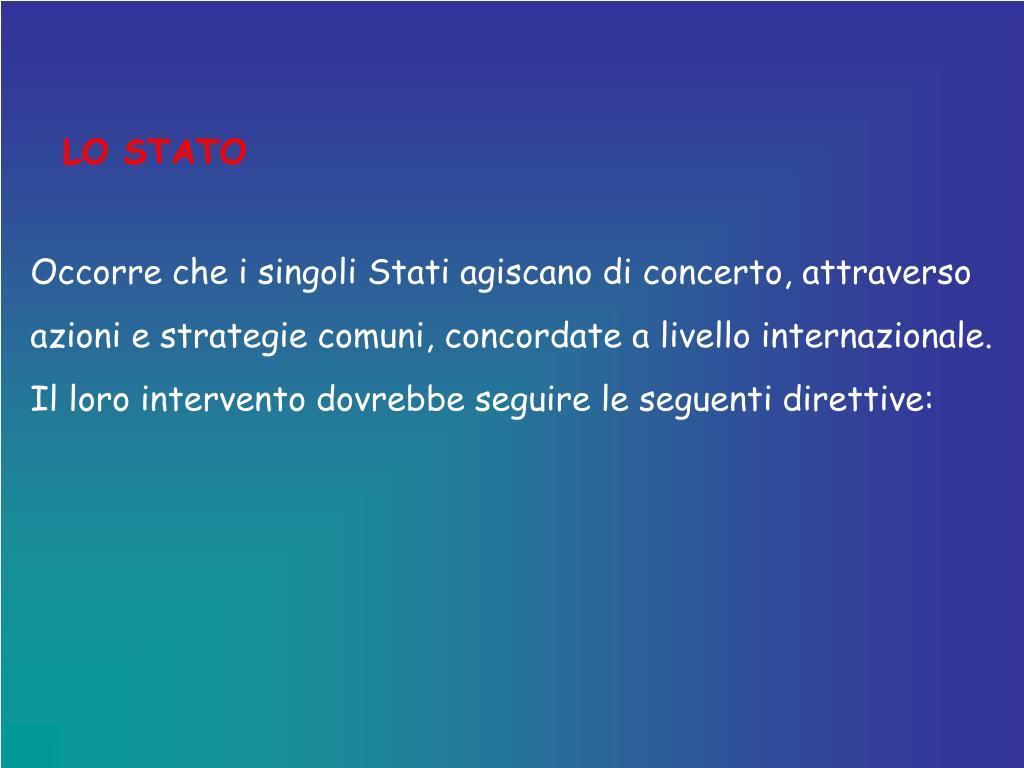 LO STATO Occorre che i singoli Stati agiscano di concerto, attraverso azioni e strategie comuni, concordate a livello internazionale. Il loro intervento dovrebbe seguire le seguenti direttive: