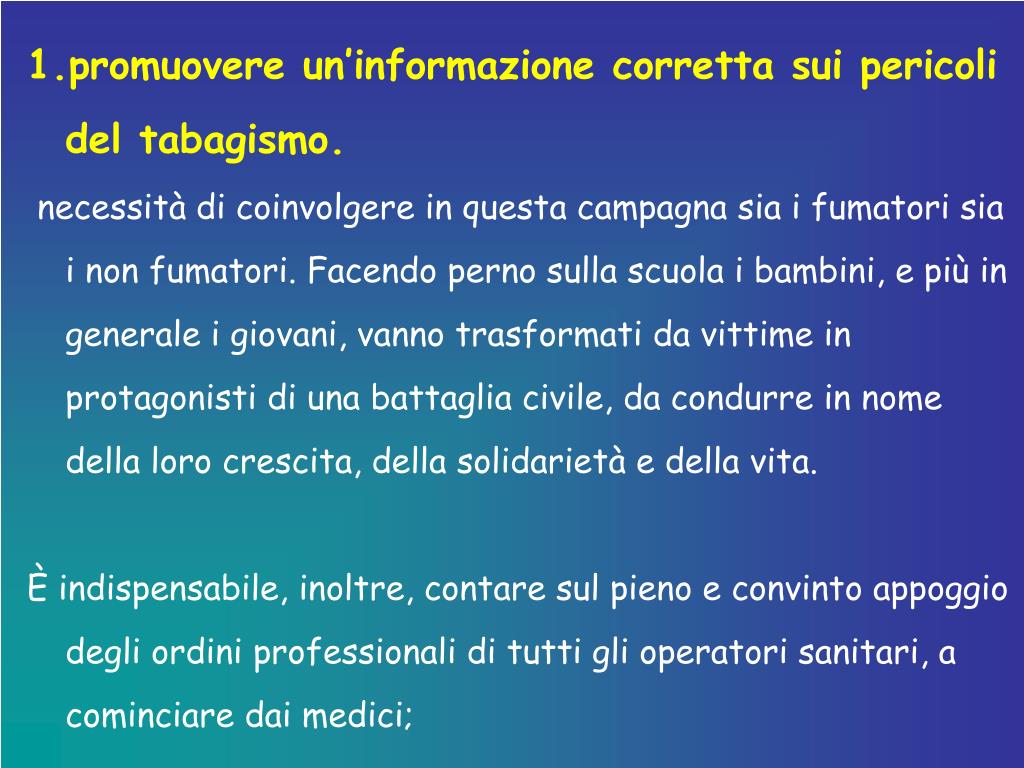 promuovere un’informazione corretta sui pericoli del tabagismo. • necessità di coinvolgere in questa campagna sia i fumatori sia i non fumatori. Facendo perno sulla scuola i bambini, e più in generale i giovani, vanno trasformati da vittime in protagonisti di una battaglia civile, da condurre in nome della loro crescita, della solidarietà e della vita. • È indispensabile, inoltre, contare sul pieno e convinto appoggio degli ordini professionali di tutti gli operatori sanitari, a cominciare dai medici;