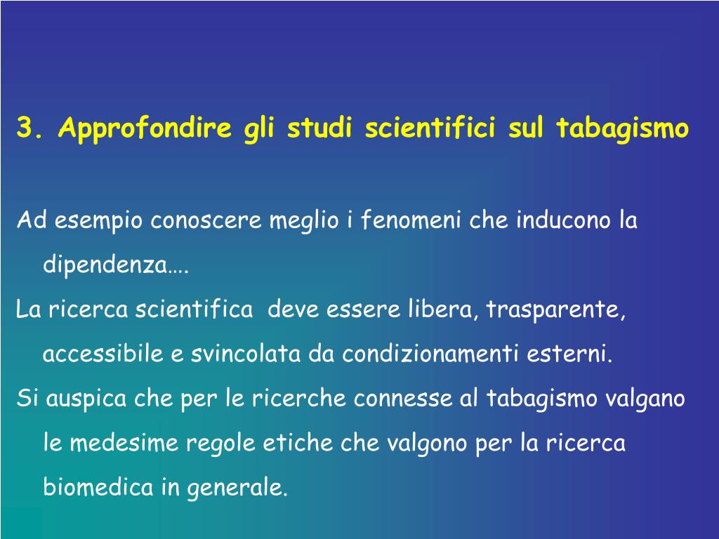 3. Approfondire gli studi scientifici sul tabagismo Ad esempio conoscere meglio i fenomeni che inducono la dipendenza…. La ricerca scientifica deve essere libera, trasparente, accessibile e svincolata da condizionamenti esterni. Si auspica che per le ricerche connesse al tabagismo valgano le medesime regole etiche che valgono per la ricerca biomedica in generale.