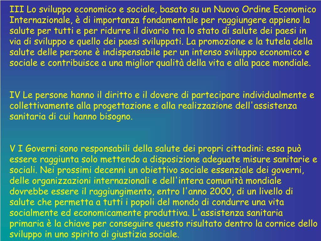 III Lo sviluppo economico e sociale, basato su un Nuovo Ordine Economico Internazionale, è di importanza fondamentale per raggiungere appieno la salute per tutti e per ridurre il divario tra lo stato di salute dei paesi in via di sviluppo e quello dei paesi sviluppati. La promozione e la tutela della salute delle persone è indispensabile per un intenso sviluppo economico e sociale e contribuisce a una miglior qualità della vita e alla pace mondiale. IV Le persone hanno il diritto e il dovere di partecipare individualmente e collettivamente alla progettazione e alla realizzazione dell'assistenza sanitaria di cui hanno bisogno. V I Governi sono responsabili della salute dei propri cittadini: essa può essere raggiunta solo mettendo a disposizione adeguate misure sanitarie e sociali. Nei prossimi decenni un obiettivo sociale essenziale dei governi, delle organizzazioni internazionali e dell'intera comunità mondiale dovrebbe essere il raggiungimento, entro l'anno 2000, di un livello di salute che permetta a tutti i popoli del mondo di condurre una vita socialmente ed economicamente produttiva. L'assistenza sanitaria primaria è la chiave per conseguire questo risultato dentro la cornice dello sviluppo in uno spirito di giustizia sociale.