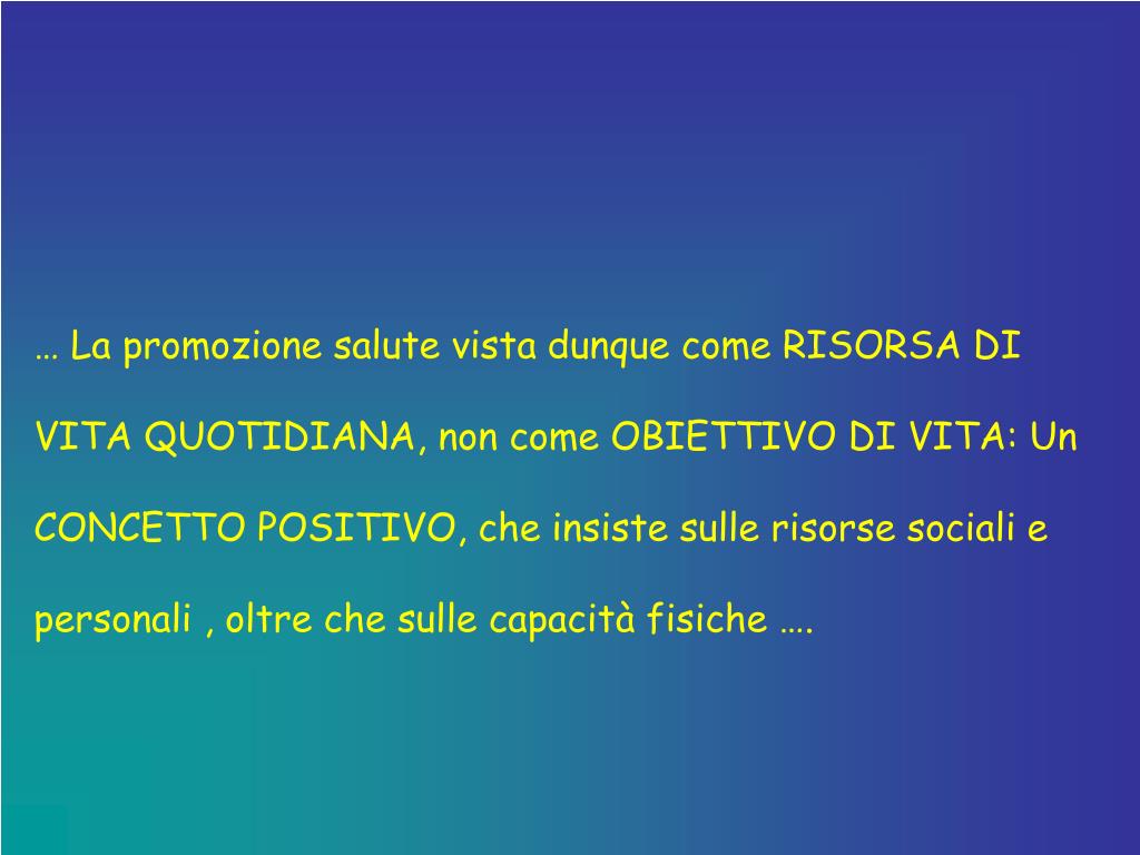 … La promozione salute vista dunque come RISORSA DI VITA QUOTIDIANA, non come OBIETTIVO DI VITA: Un CONCETTO POSITIVO, che insiste sulle risorse sociali e personali , oltre che sulle capacità fisiche ….