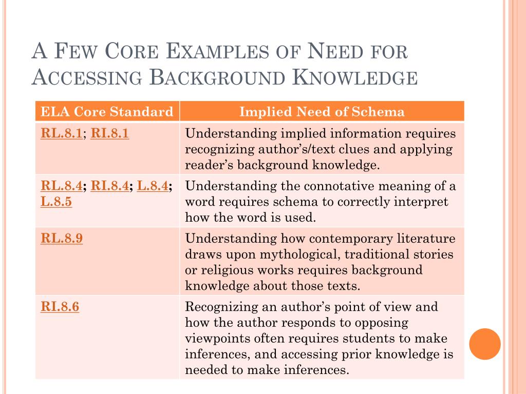 Accessing and Building B/K, cont. • A few examples that imply the need for students to access prior knowledge are included in the table on the following slide, but more implications can be found by studying ALL the ELA standards. One more IMPORTANT point: • Core Standards-based instruction BUILDS background knowledge.