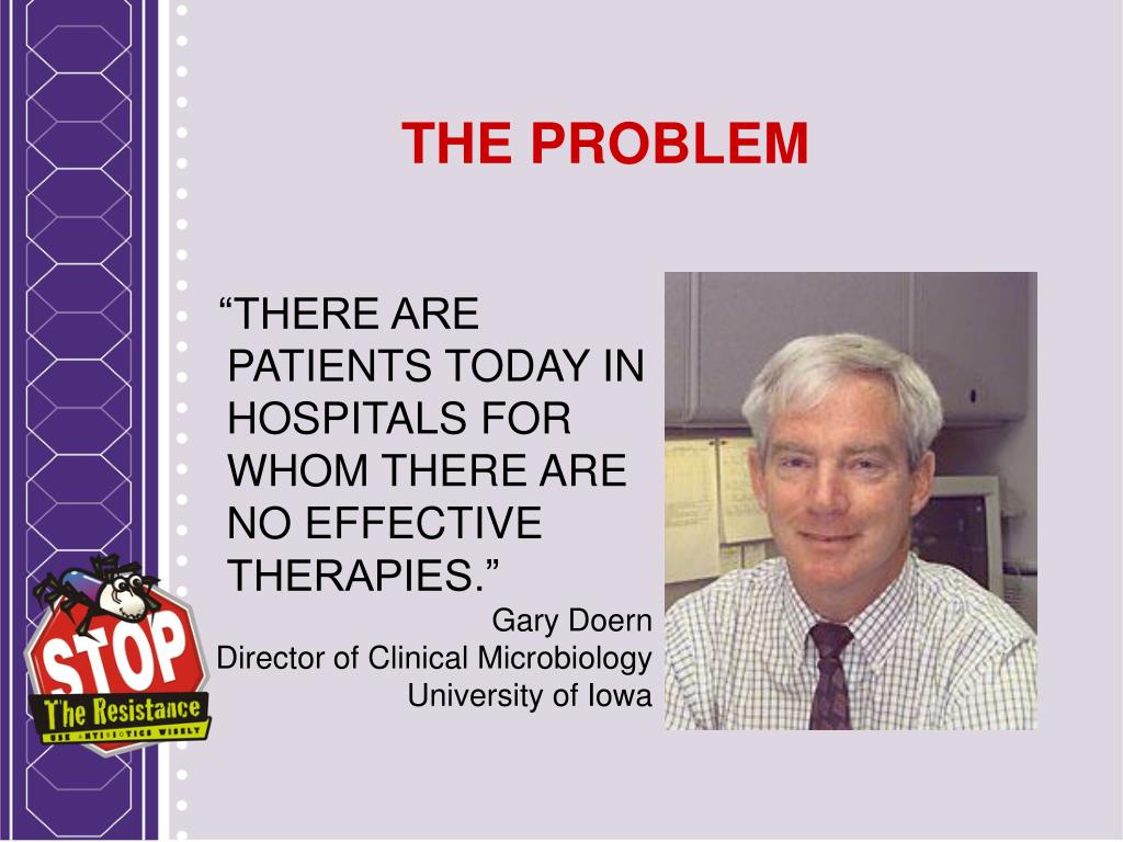 THE PROBLEM “THERE ARE PATIENTS TODAY IN HOSPITALS FOR WHOM THERE ARE NO EFFECTIVE THERAPIES.” Gary Doern Director of Clinical Microbiology University of Iowa