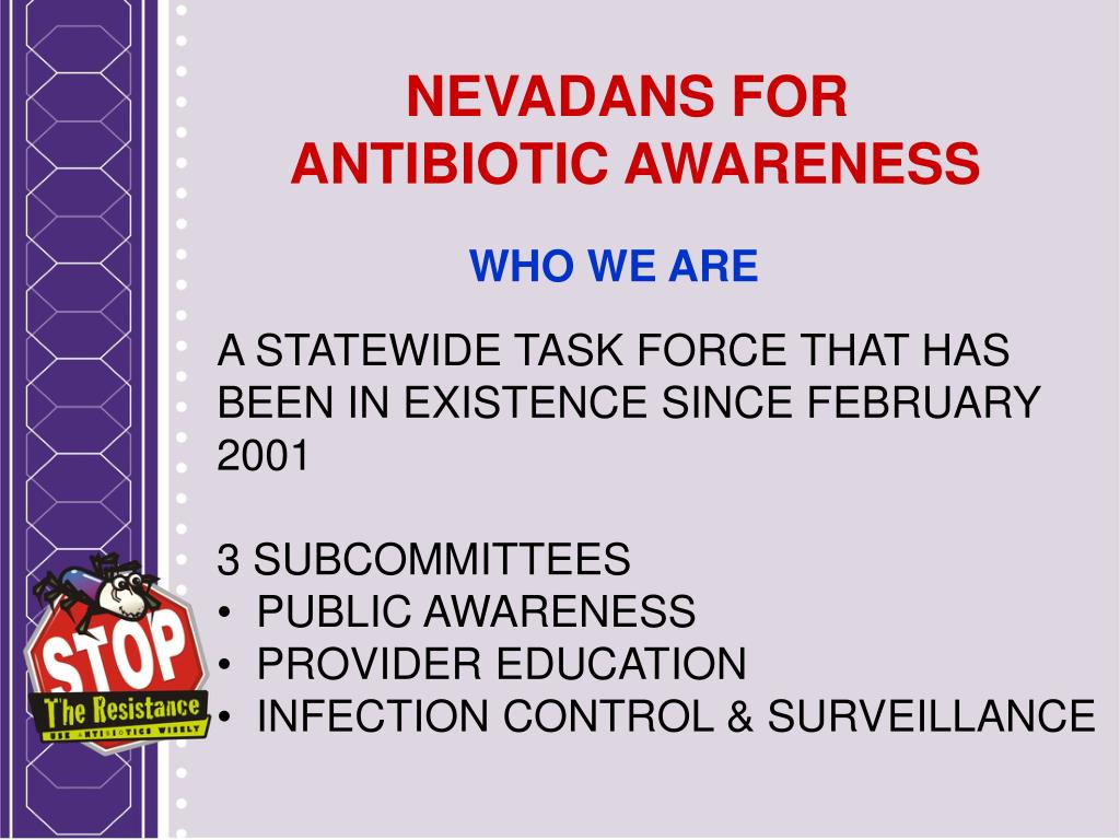 NEVADANS FOR ANTIBIOTIC AWARENESS WHO WE ARE • A STATEWIDE TASK FORCE THAT HAS BEEN IN EXISTENCE SINCE FEBRUARY 2001 • 3 SUBCOMMITTEES • PUBLIC AWARENESS • PROVIDER EDUCATION • INFECTION CONTROL & SURVEILLANCE