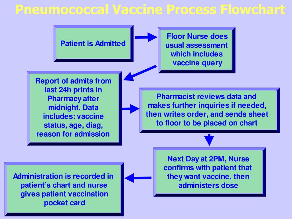 Pneumococcal VaccineProcess Revision • Proposed Protocol: • Nurse assessment as before, list sent to pharmacy • Move to a Pharmacist-Directed approach: • Past success with IVtoPO conversion • Change in Medicare Regulations • Pharmacist will write order to administer Vaccine next day • Physician and/or Patient has over-ride ability