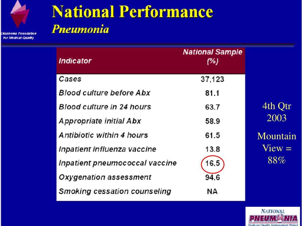 Program Revised in 1999 MountainView Hospital • Criteria checked by admitting nurse • Over 65 • Hx of COPD,CHF,CAP,Splenectomy, No previous vaccine • If criteria is met, chart is stamped with an optional order for the physician to check off • Once ordered, the patient was to receive the vaccine after consent was signed • Started June 1999