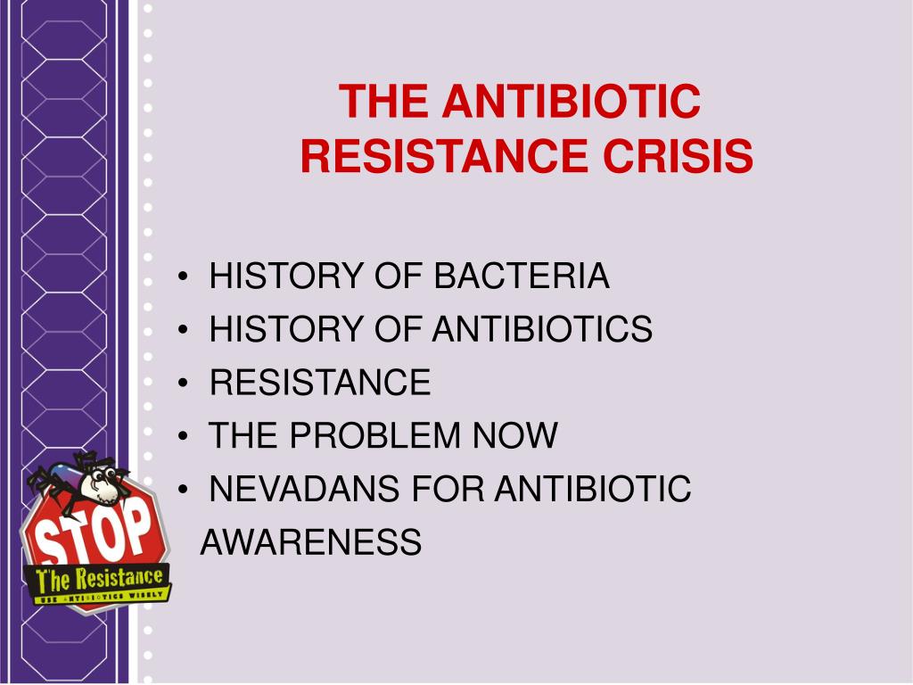 THE ANTIBIOTIC RESISTANCE CRISIS • HISTORY OF BACTERIA • HISTORY OF ANTIBIOTICS • RESISTANCE • THE PROBLEM NOW • NEVADANS FOR ANTIBIOTIC AWARENESS