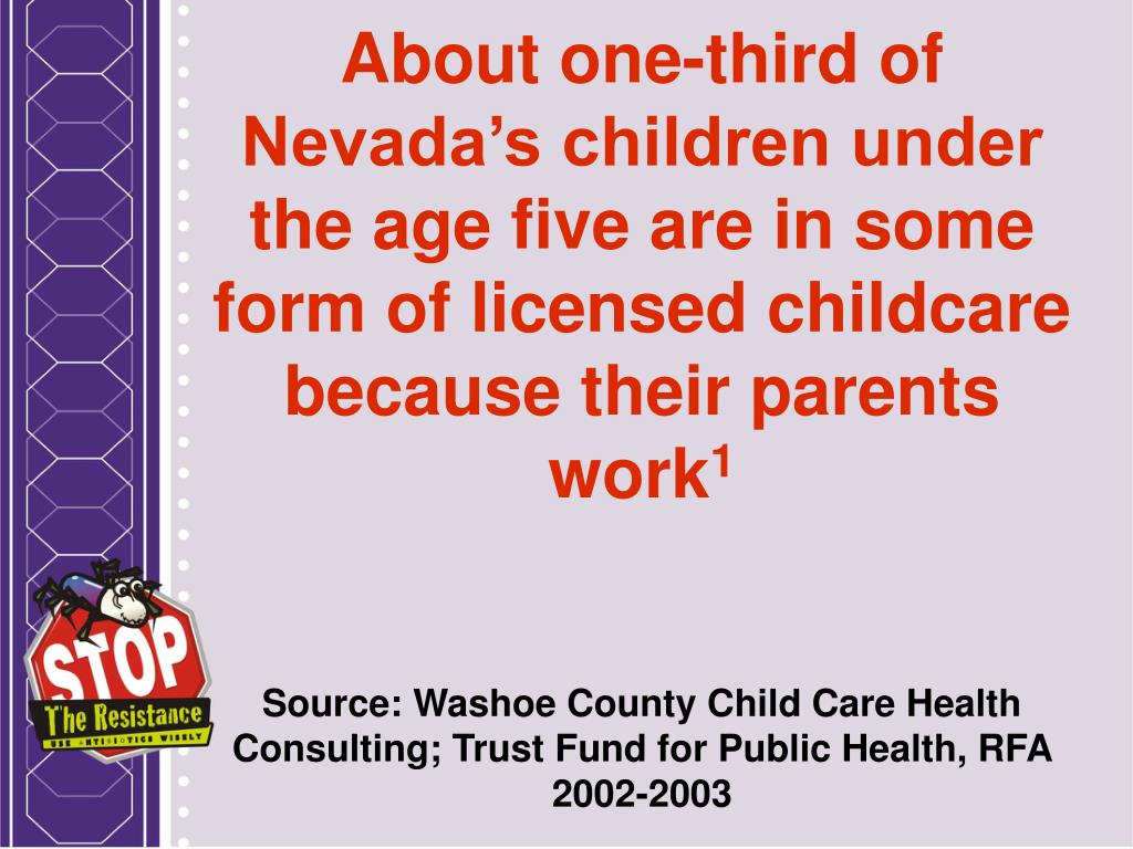 About one-third of Nevada’s children under the age five are in some form of licensed childcare because their parents work1Source: Washoe County Child Care Health Consulting; Trust Fund for Public Health, RFA 2002-2003