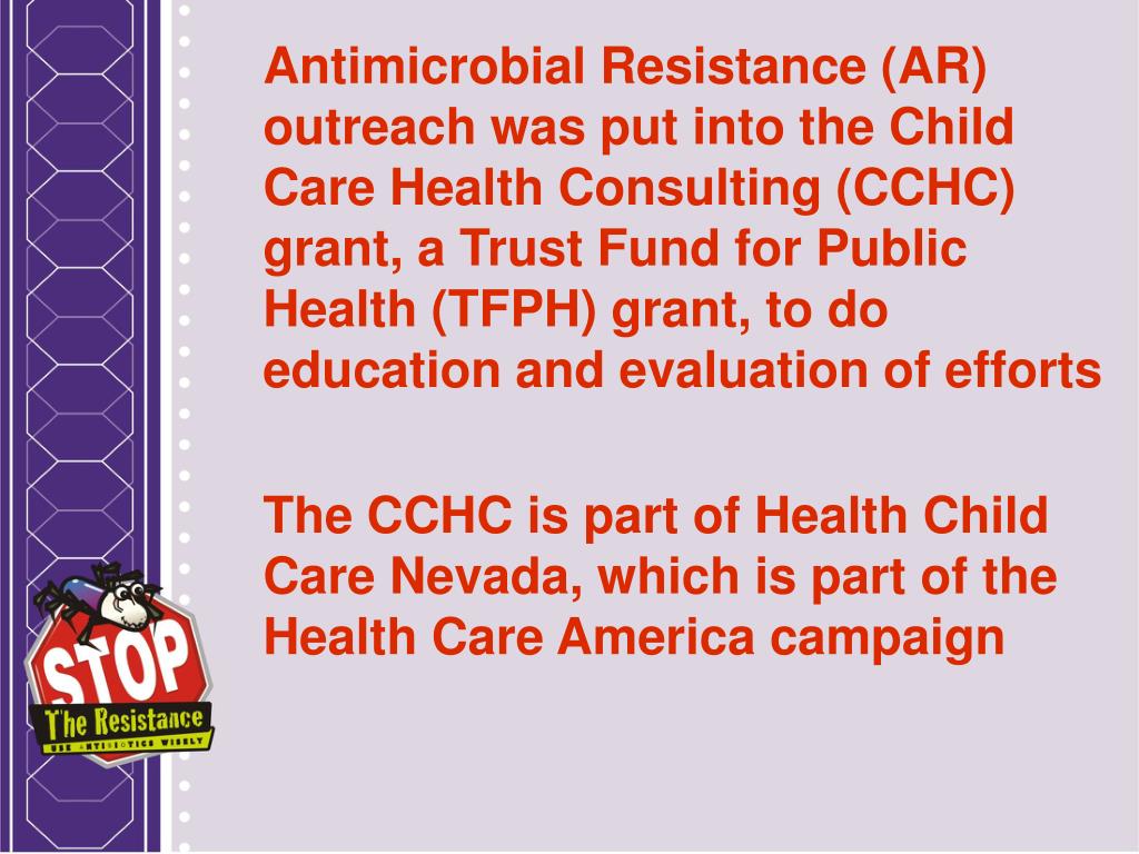 Antimicrobial Resistance (AR) outreach was put into the Child Care Health Consulting (CCHC) grant, a Trust Fund for Public Health (TFPH) grant, to do education and evaluation of efforts The CCHC is part of Health Child Care Nevada, which is part of the Health Care America campaign
