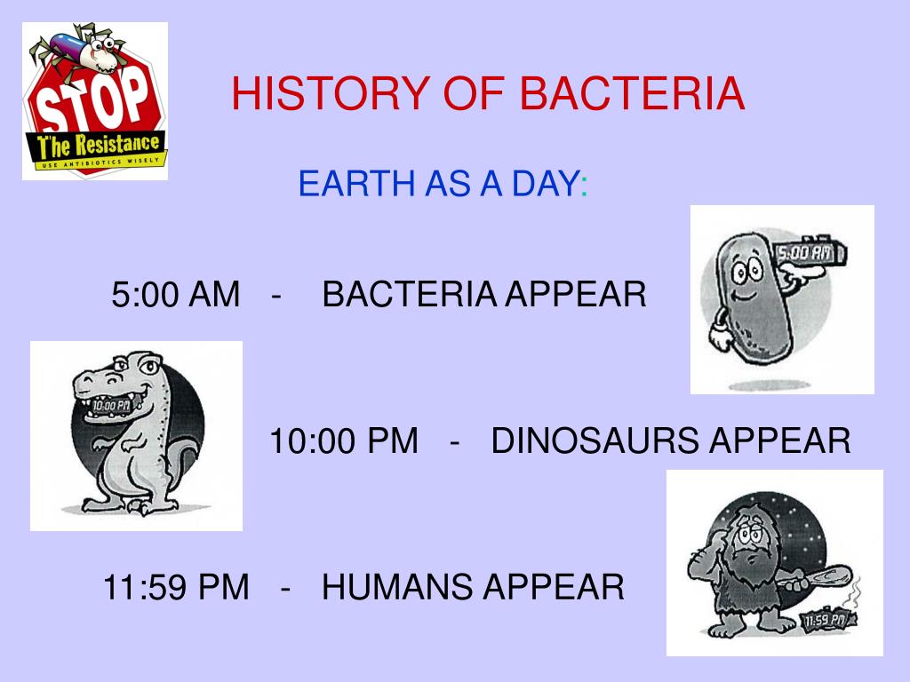 HISTORY OF BACTERIA EARTH AS A DAY: 5:00 AM - BACTERIA APPEAR 10:00 PM - DINOSAURS APPEAR 11:59 PM - HUMANS APPEAR