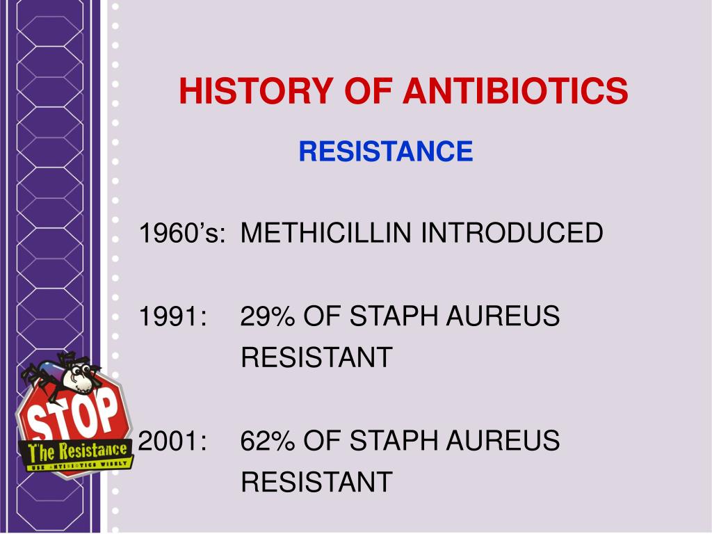 HISTORY OF ANTIBIOTICS RESISTANCE 1960’s: METHICILLIN INTRODUCED 1991: 29% OF STAPH AUREUS RESISTANT 2001: 62% OF STAPH AUREUS RESISTANT