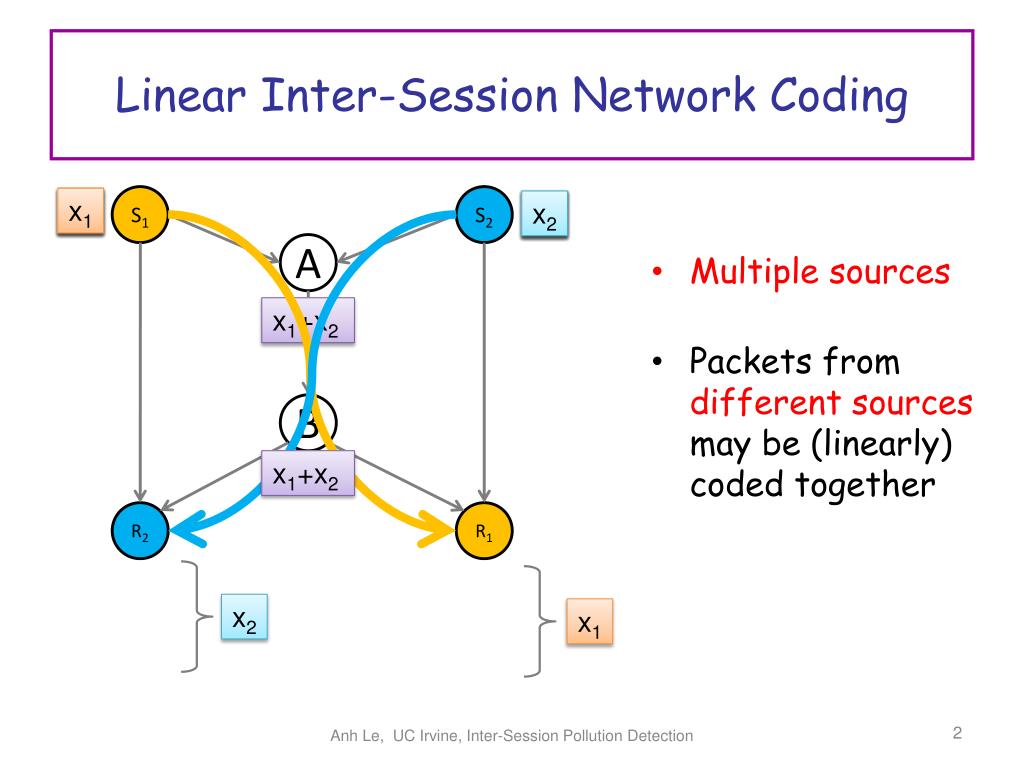 On Detecting Pollution Attacks in Inter-Session Network Coding. Anh Le, Athina Markopoulou University of California, Irvine. Linear Inter-Session Network Coding. S 1. S 2. x 1. x 1. x 1. x 2. x 2. x 2. Multiple sources Packets from different sources may be (linearly) coded together.