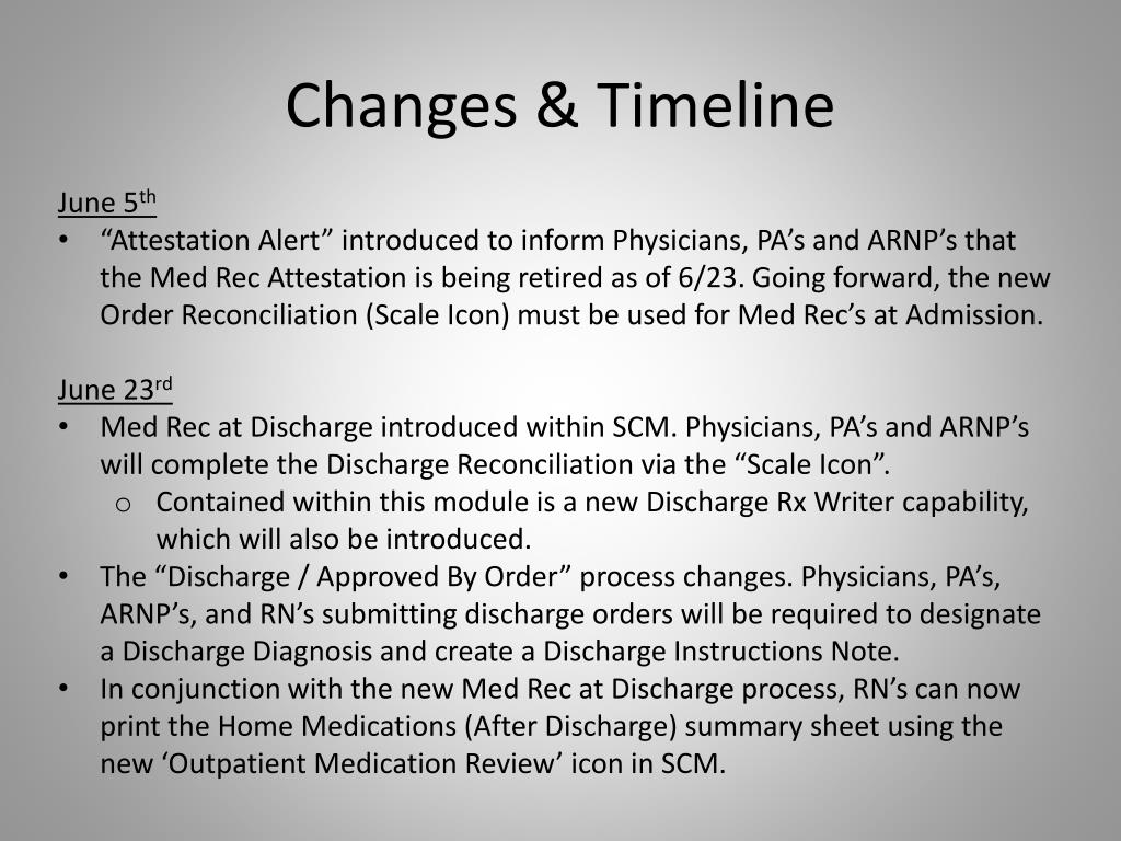 Changes & Timeline • June 5th • “Attestation Alert” introduced to inform Physicians, PA’s and ARNP’s that the Med Rec Attestation is being retired as of 6/23. Going forward, the new Order Reconciliation (Scale Icon) must be used for Med Rec’s at Admission. • June 23rd • Med Rec at Discharge introduced within SCM. Physicians, PA’s and ARNP’s will complete the Discharge Reconciliation via the “Scale Icon”. • Contained within this module is a new Discharge Rx Writer capability, which will also be introduced. • The “Discharge / Approved By Order” process changes. Physicians, PA’s, ARNP’s, and RN’s submitting discharge orders will be required to designate a Discharge Diagnosis and create a Discharge Instructions Note. • In conjunction with the new Med Rec at Discharge process, RN’s can now print the Home Medications (After Discharge) summary sheet using the new ‘Outpatient Medication Review’ icon in SCM.