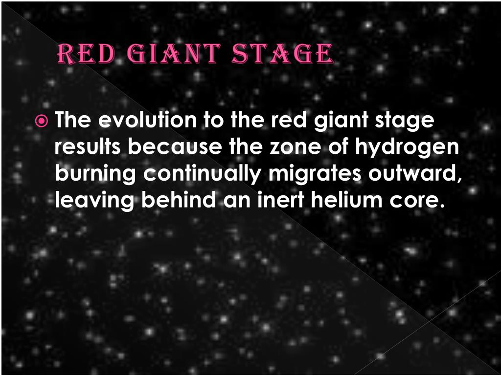 RED GIANT STAGE • The evolution to the red giant stage results because the zone of hydrogen burning continually migrates outward, leaving behind an inert helium core.