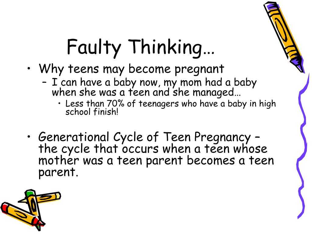 Teenage Pregnancy. What are some risks of being a teenage parent?. Faulty Thinking…. Why teens may become pregnant I can have a baby now, my mom had a baby when she was a teen and she managed… Less than 70% of teenagers who have a baby in high school finish!