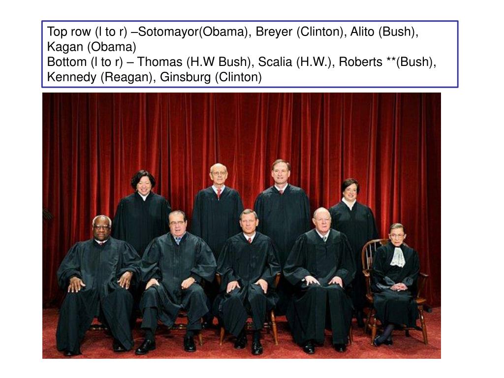 Top row (l to r) –Sotomayor(Obama), Breyer (Clinton), Alito (Bush), Kagan (Obama) Bottom (l to r) – Thomas (H.W Bush), Scalia (H.W.), Roberts **(Bush), Kennedy (Reagan), Ginsburg (Clinton)