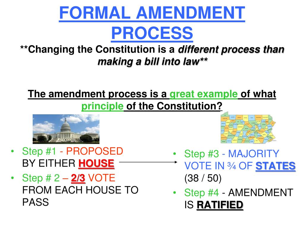 Step #1 - PROPOSED BY EITHER HOUSE Step # 2 – 2/3 VOTE FROM EACH HOUSE TO PASS Step #3 - MAJORITY VOTE IN ¾ OF STATES(38 / 50) Step #4 - AMENDMENT IS RATIFIED FORMAL AMENDMENT PROCESS**Changing the Constitution is a different process than making a bill into law**The amendment process is a great example of what principle of the Constitution?