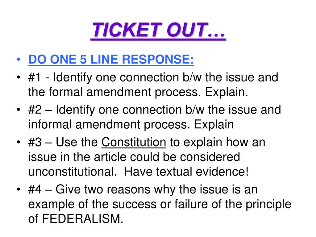 TICKET OUT… • DO ONE 5 LINE RESPONSE: • #1 - Identify one connection b/w the issue and the formal amendment process. Explain. • #2 – Identify one connection b/w the issue and informal amendment process. Explain • #3 – Use the Constitution to explain how an issue in the article could be considered unconstitutional. Have textual evidence! • #4 – Give two reasons why the issue is an example of the success or failure of the principle of FEDERALISM.