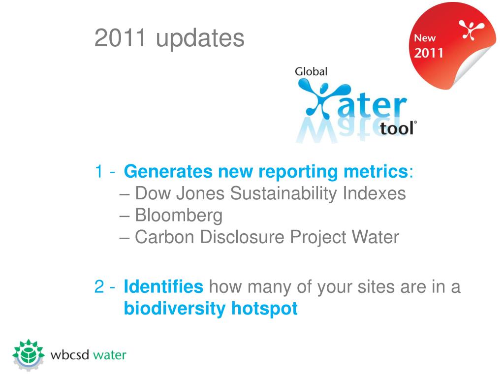 2011 updates • 1 - Generates new reporting metrics: • Dow Jones Sustainability Indexes • Bloomberg • Carbon Disclosure Project Water 2 - Identifies how many of your sites are in a biodiversity hotspot